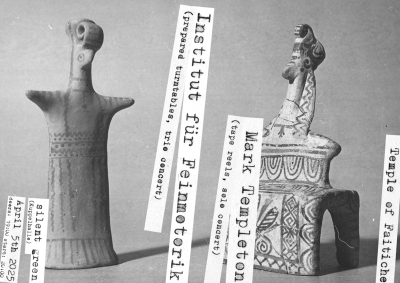 Temple of Faitiche presents: composing with media. An evening at silent green with Mark Templeton & Institut für Feinmotorik on April 5th 2025. The now legendary Institut für Feinmotorik is back as a trio after a break of several years. IFF will present a performance for 8 prepared turntables and 4 dj-mixers. The Canadian media artist Mark Templeton will present his last album Two Verses as an a/v-performance. Tickets