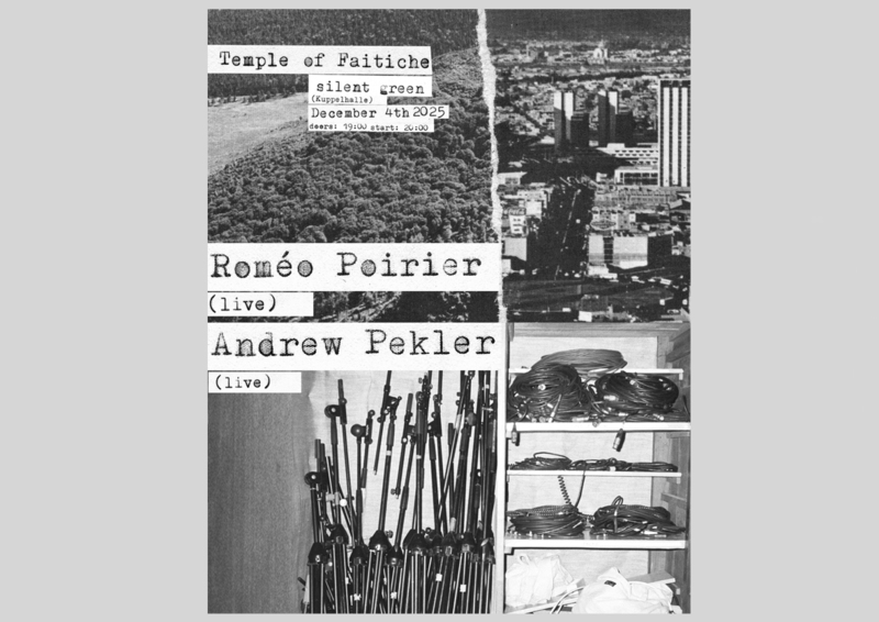 Temple of Faitiche with Andrew Pekler & Roméo Poirier: Faitiche returns to silent green to present two album premieres. Andrew Pekler will perform his album New Environments & Rhythm Studies with an A/V show - and also Romeo Poirier will present his Off The Record for the first time in Berlin. More info here.