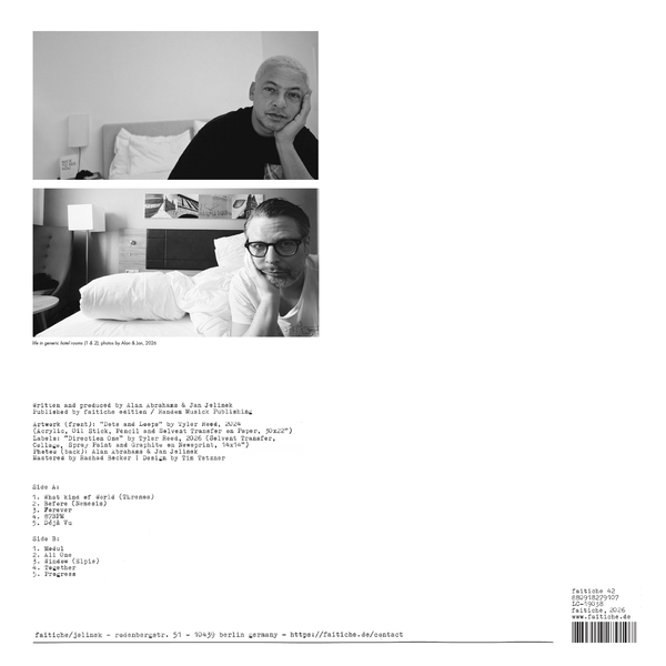 The two had crossed paths before really getting to know each other after Abrahams invited Jelinek to play at one of his Süd Electronic parties. The idea of a collaboration emerged slowly. “It started as an experiment, and over the past few years grew from a few tracks into this album,” says Abrahams. He describes recording the basic material as a “tantalizing” process, not knowing how Jelinek would transform his material, some of which was based on wordless chanting, while other tracks were working with lyrical content. However, their mutual trust allowed Jelinek to remove the harmonies, radically reduce the rhythms, and concentrate on Abrahams’ voice.